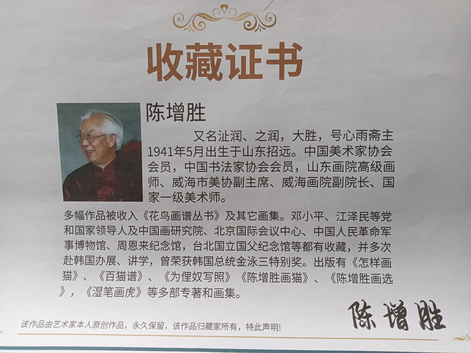 | 作者简介 | 陈增胜(b.1941),山东招远人。中国美术家协会会员,中国书法家协会会员,国家一级美术师,山东画院高级画师、威海市美协副主席、威海画院副院长。多幅作品被中国画研究院、北京国际会议中心、中国人民革命军事博物馆、周恩来纪念馆等单位收藏,多次赴韩国举办展览并讲学,荣获韩国总统金泳三特别奖。出版有《怎样画猫》《百猫谱》《为俚奴写照》《陈增胜画猫》《陈增胜画选》《湿笔画虎》等多部专著和画集。 | ||