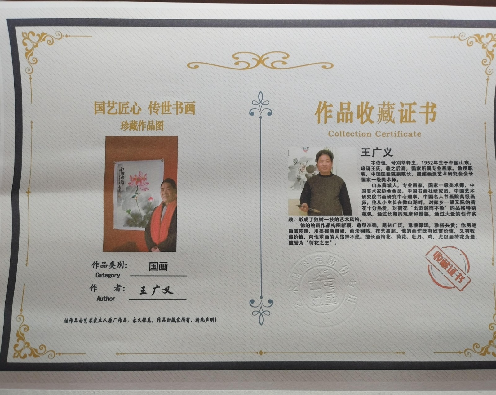 | 作者简介 | 王广义(b.1952),山东薛城人。国家一级美术师,中国美术家协会会员,中国国画院副院长,墨酣画派艺术研究会会长,中国书画社研究员,中国艺术研究院书画研究中心理事,中国名人书画院高级画师。他的画作既有欣赏价值,又有收藏价值,许多作品收藏于人民大会堂、中央办公厅、中国美术馆、南京书画院、李苦禅纪念馆等。创作的巨幅荷花作品《和谐盛世,微湖飘香》,被吉尼斯授以“亚洲第一荷”的称号”,作品《荷花》荣获中国文化部,中国艺术研究院颁发的全国“精品奖”,中国文联、人民美术出版社为其出版了个人荷花作品集。 | ||