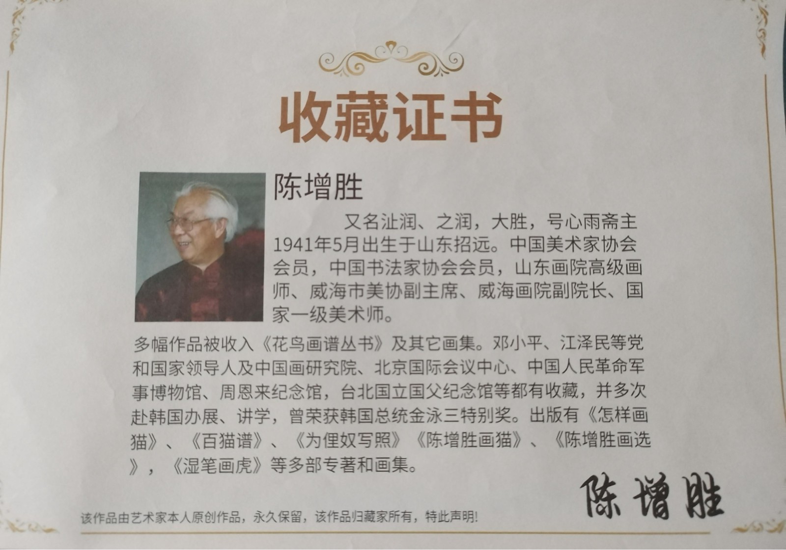 | 作者简介 | 陈增胜(b.1941),山东招远人。中国美术家协会会员,中国书法家协会会员,国家一级美术师,山东画院高级画师、威海市美协副主席、威海画院副院长。多幅作品被中国画研究院、北京国际会议中心、中国人民革命军事博物馆、周恩来纪念馆等单位收藏,多次赴韩国举办展览并讲学,荣获韩国总统金泳三特别奖。出版有《怎样画猫》、《百猫谱》、《为俚奴写照》《陈增胜画猫》、《陈增胜画选》、《湿笔画虎》等多部专著和画集。 | ||